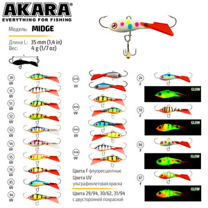 Балансир Akara Midge 35 разработан для зимней ловли хищных рыб, таких как окунь и судак. Балансир изготовлен из качественных, морозостойких материалов и оснащен высокопрочными крючками и тройниками японской компании Maruto. Длинна балансира 35 миллиметров, вес - 4 грамм. Балансиры этой модели красятся в уловистые цвета, причем окрашивание осуществляется с применением флуоресцентных UV красок (светятся в ультрафиолетовом диапазоне), либо с использованием люминесцентных фосфорных красок (светятся в темноте). Балансир прекрасно отзывается на анимацию и имеет яркую, высокоамплитудную игру, которая может спровоцировать на поклевку даже пассивного хищника. Балансир Akara Midge станет прекрасным пополнением арсенала любителей зимней рыбалки.
