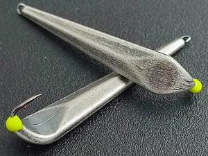 Поскольку технология изготовления не позволяет ставить на блесне клеймо, а различать тяжелую и легкую версии нужно - решено было просто окраску носика менять. На тяжелый - желтая капля, на легкий - оранжевая. Легкая версия при длине 40мм весит 3,4г, а тяжелая версия при той же длине весит уже 4,1г. Вторая версия Гвоздя - "Тощий Гвоздь". Блесны близкие по форме и по работе. Но они значительно более узкие и поверхности более плоские, без ребер. Точно так же в этой блесне я сделал 2 версии - Лайт и Хард, Веса "Тощего Гвоздя" при размере 40мм: Лайт - 2,9г, Хэви - 3,6г
